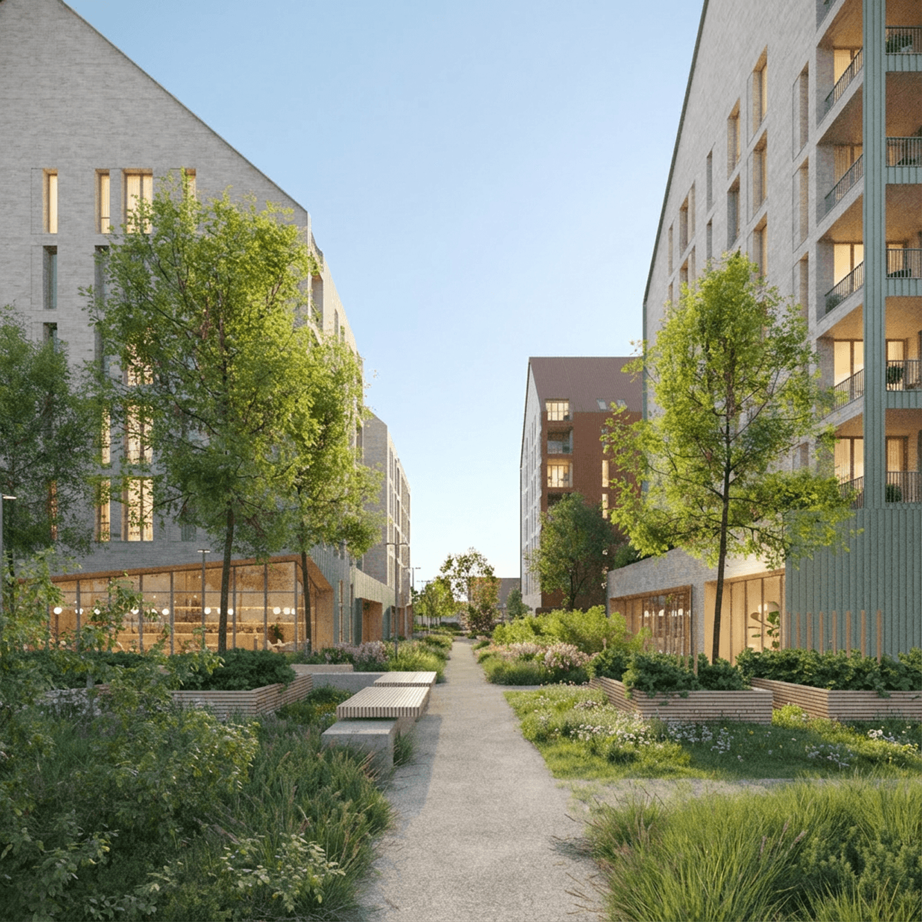 Landscaped courtyards, shared terraces, and pedestrian connections provide places for gathering and rest. These amenities are designed to remain flexible over time, supporting seasonal use, resident programming, and long-term adaptability while integrating stormwater management and planting strategies.