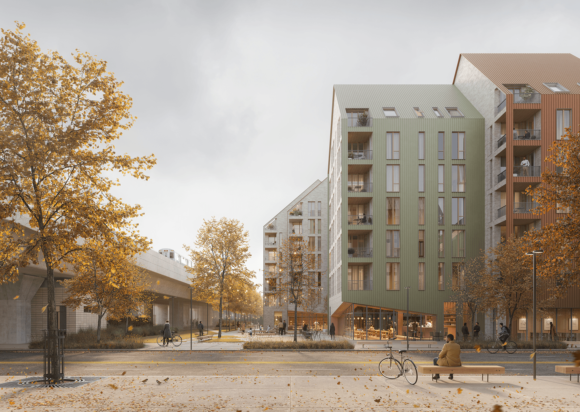 Transparent storefronts and residential lobby spaces create visual connection between interior programs and the public realm. Landscape elements, seating areas, and clear pedestrian paths soften the building edge and establish a welcoming threshold between public and private space, reinforcing the street as a social environment rather than a residual condition.